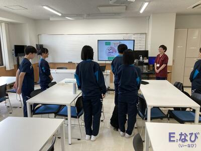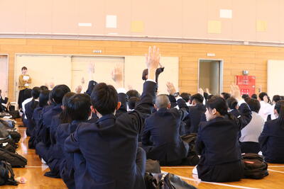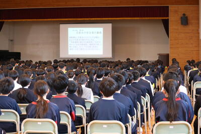 交通安全に対する意識を高めました。講師の方の分かりやすいスライドで、校区内の危険箇所や危険を回避する方法などについて、生徒たちは熱心に話を聞いていました。