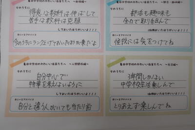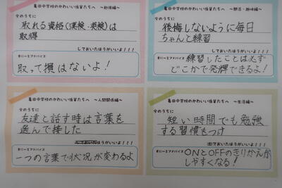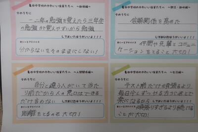 具体的なアドバイスの内容については、以下の写真をご覧ください。3年生の想いがこもった、力強く温かいメッセージの数々をぜひご確認いただければと思います。